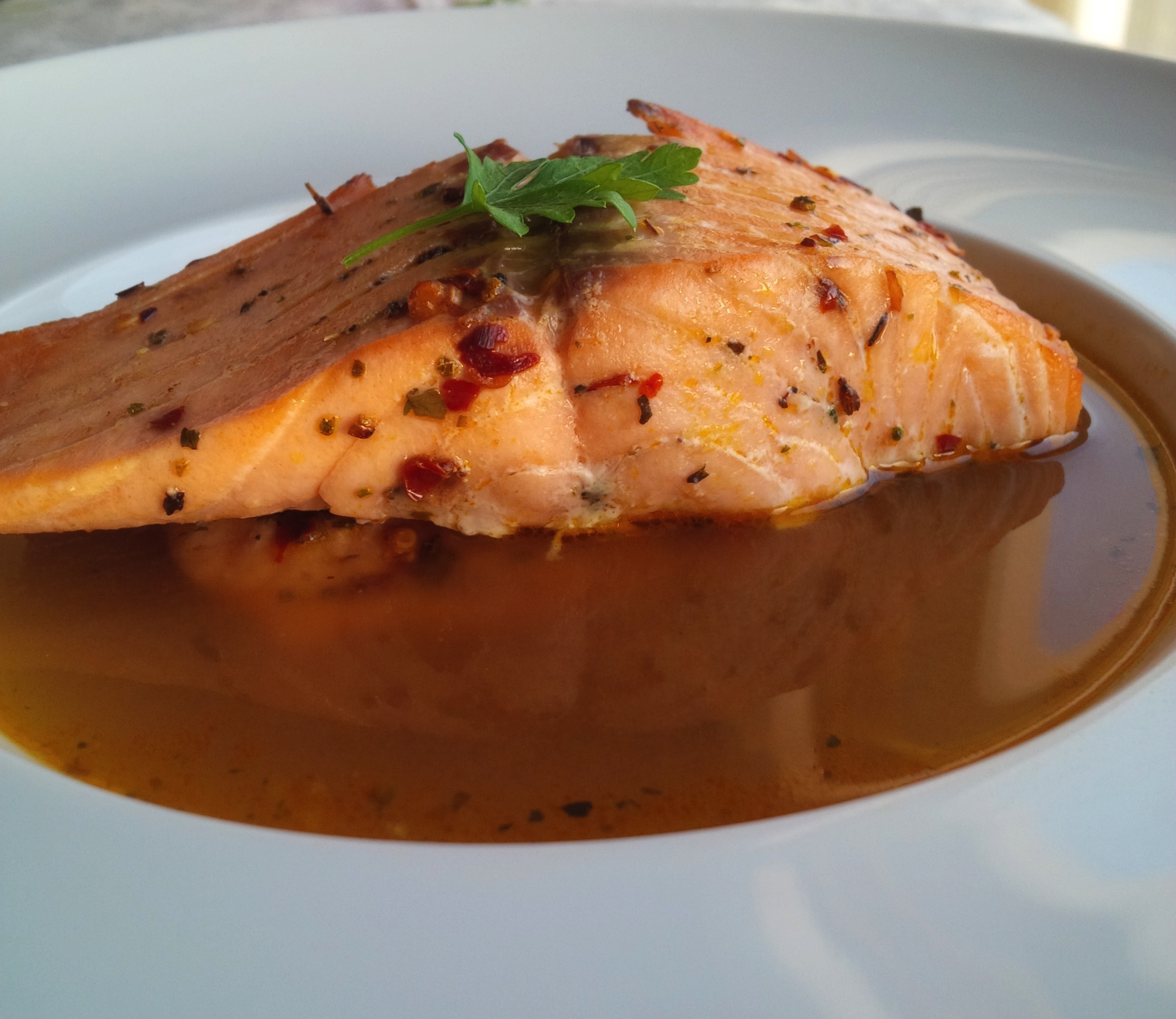 Chicken stock? I made this from cooked chicken with all the magic ingredients…(story for another day) cool stuff. I sieved the stock after cooking the chicken to get rid of the residue from the ingredients and other stuffs. Then I transferred the stock to a clean pot and allowed to simmer on very low heat. while thats settling, I began preping my salmon. Sized it to the perfect shape then marinaded it with dry fish seasoning, crushed chilies, pinch of salt and 2 drops of liquid maggi. Oh my Oh my….