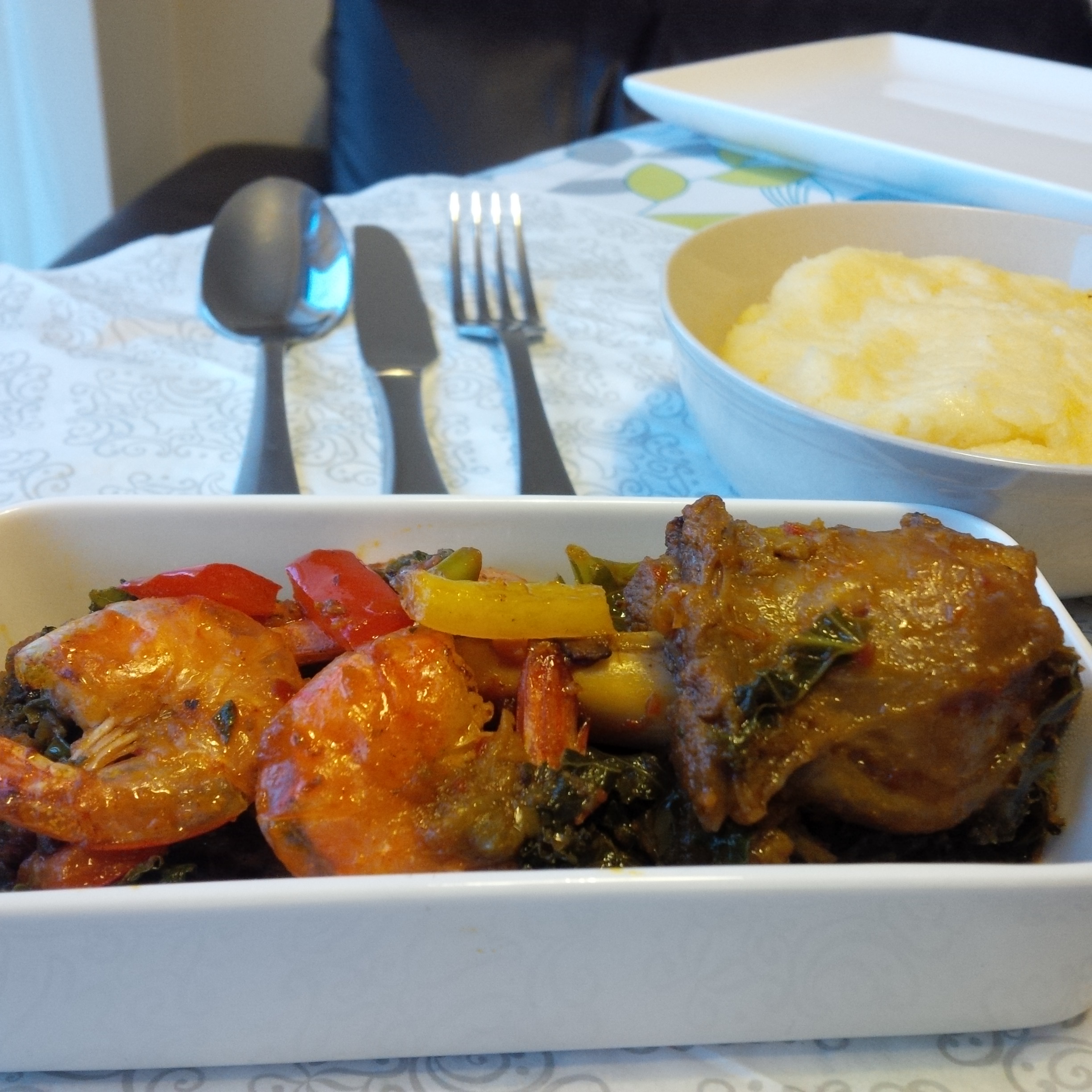 For the Swallow, I used coarse semolina and for the Efo I used Kale. Also featured are scotch bonnets (peppers), onions, palm oil, grilled prawns, lamb, locust beans (Iru) and Maggi.
