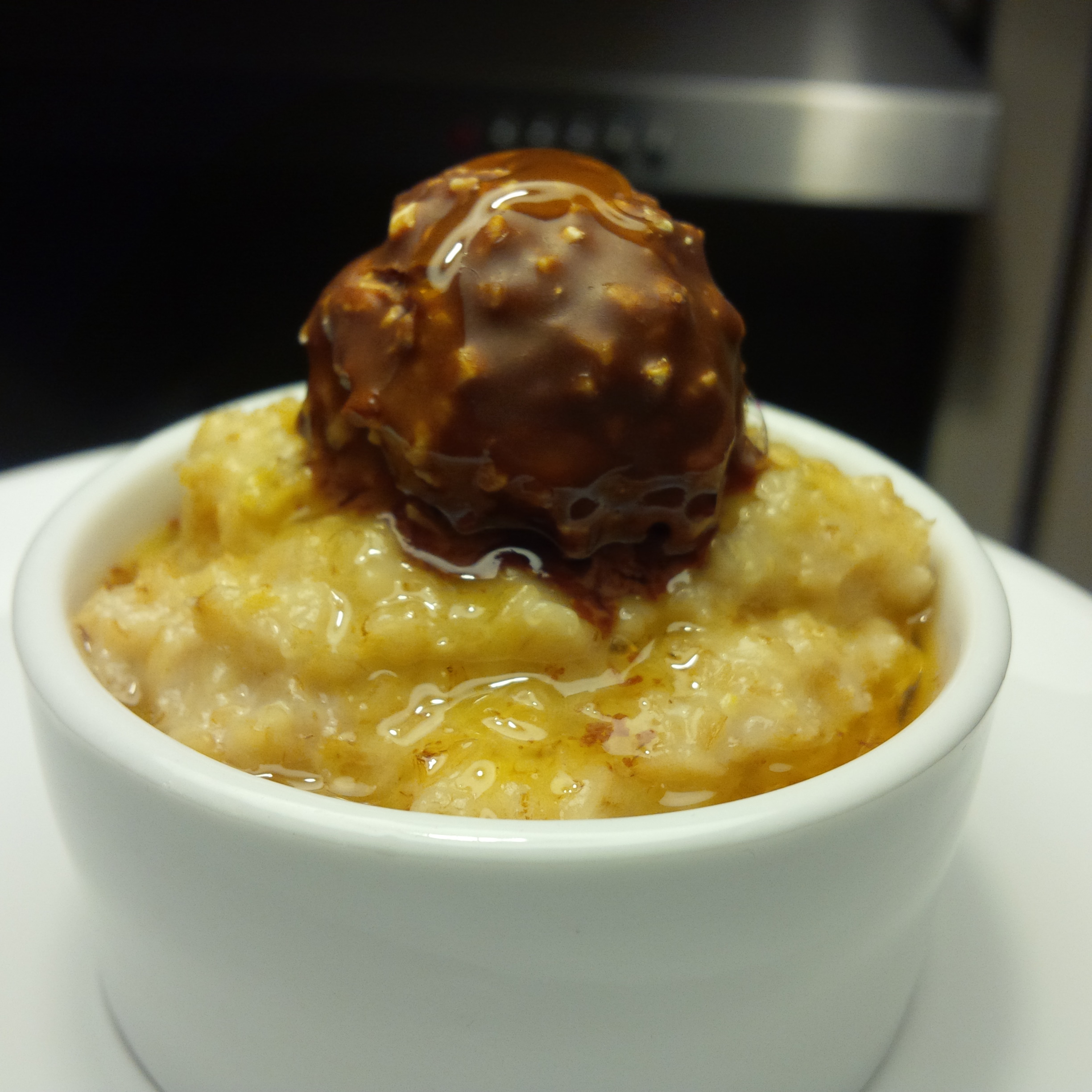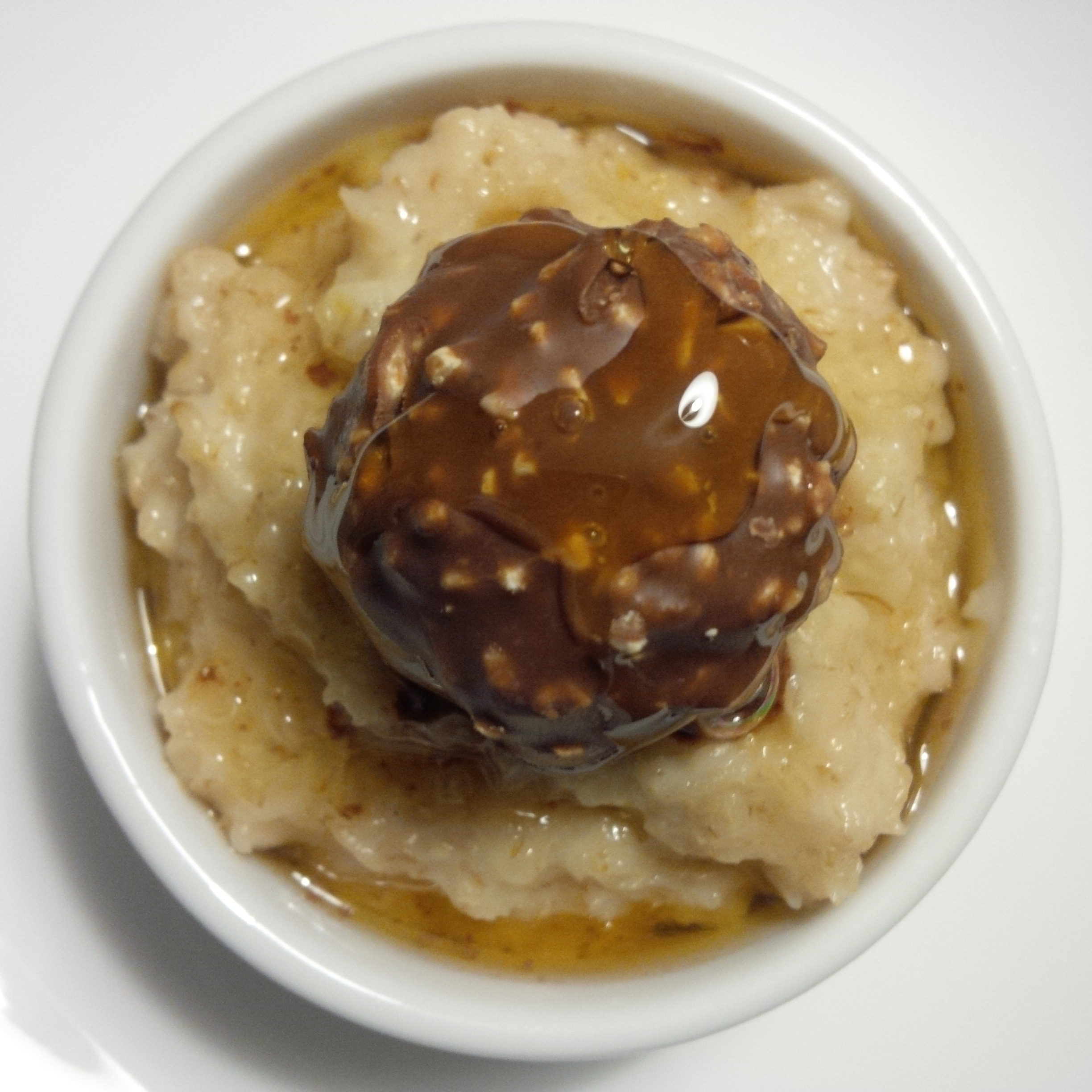 Cooked very little Oats to my preference with some almond milk allowed it to settle in a small shot like porcelain bowl, dropped one Ferrero Rocher chocolate on it then drizzled with maple syrup. Oh my Oh my, you can’t understand until you try it. Just as the oats absorbs the chocolate is an escapade on its own not to talk of the “choco – l – oat” like sensation felt.