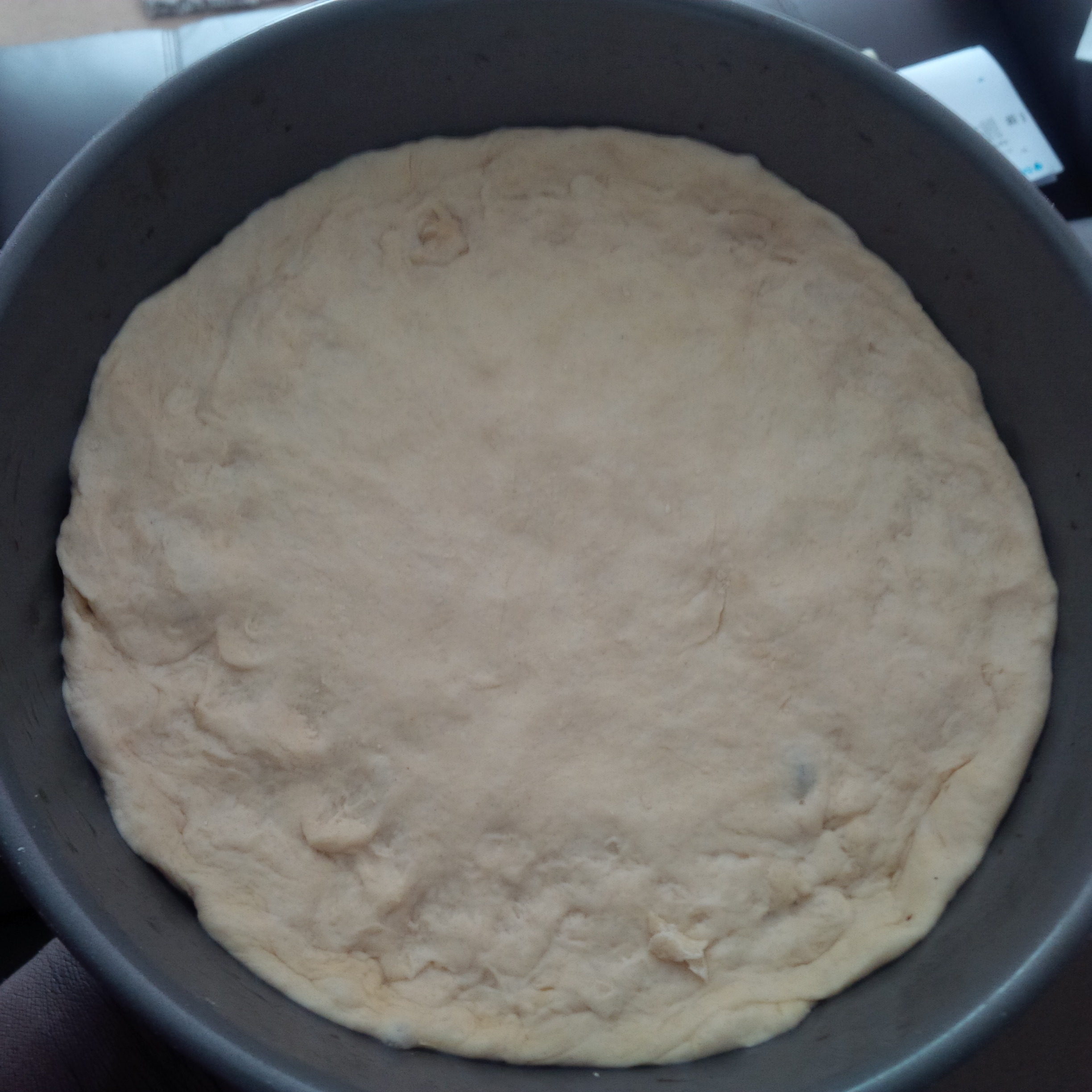 Roll and stretch the dough to the desired shape, place on a greased (olive oil) baking pan and leave somewhere warm for about 15 mins till its risen slightly