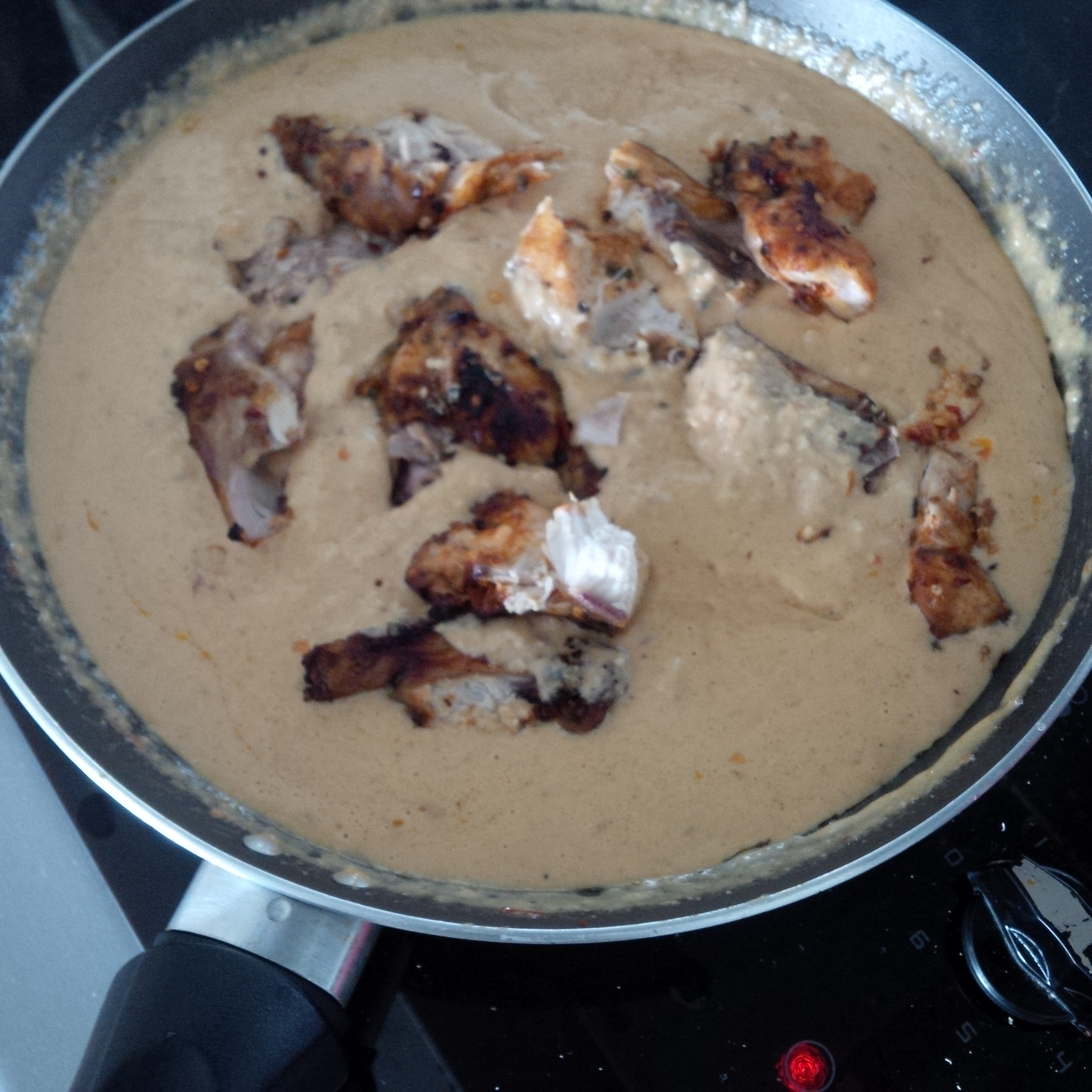 Pour in a glass of coconut milk to the condiments in the frypan, followed by the cashew paste. allow to simmer for one minute, add the chopped grilled or cooked chicken.